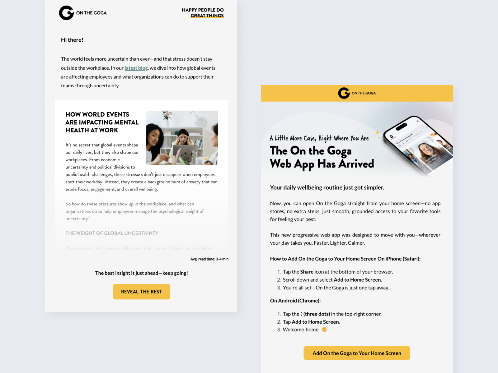 Working alongside the Lead Graphic Designer, I created a range of branded materials that reflect On the Goga’s human-centered approach to workplace wellbeing. This work included designing interactive presentation decks for wellness workshops, informational ads, social media content, landing pages, and email campaigns, each tailored to maintain visual consistency and clearly communicate the brand’s values across platforms.